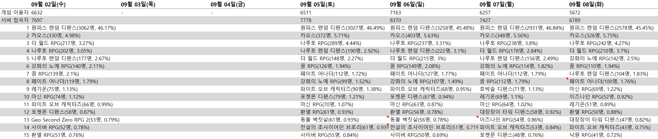 ※ 9월 3일~4일 서버 정전 및 통계 관련 API 이상으로 기록 불가.