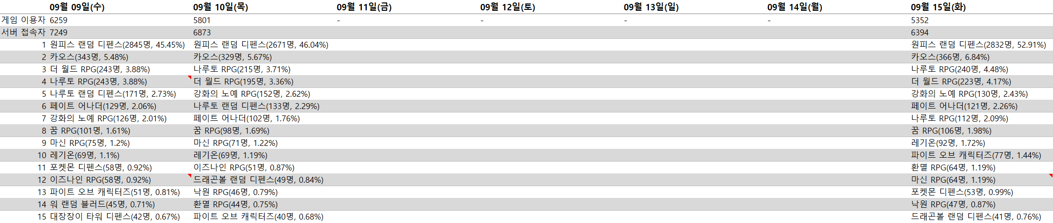 ※ 9월 14일 서버 부하로 인한 렉으로 이용자 수가 적어 표본 데이터가 부족하여 생략.