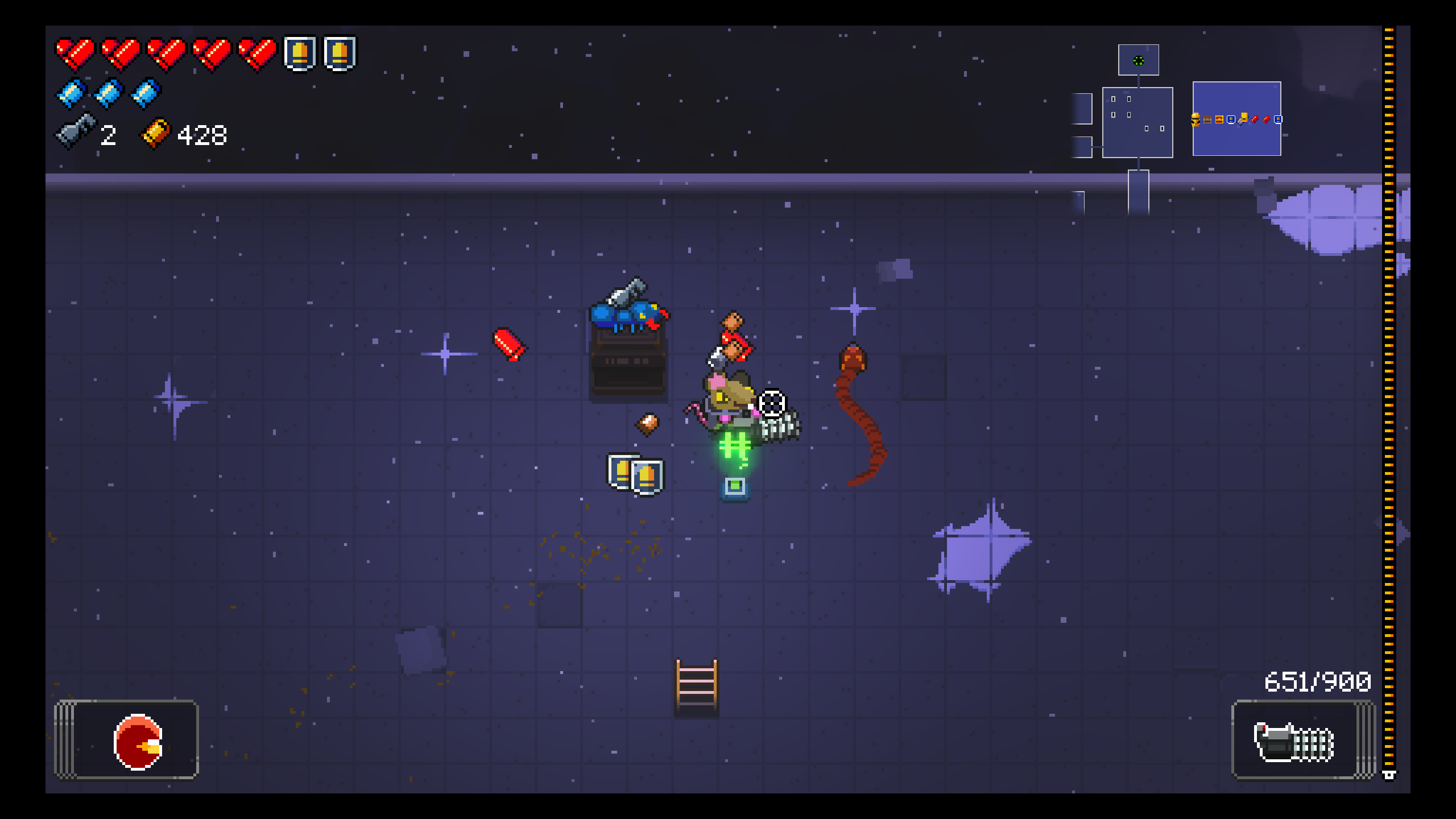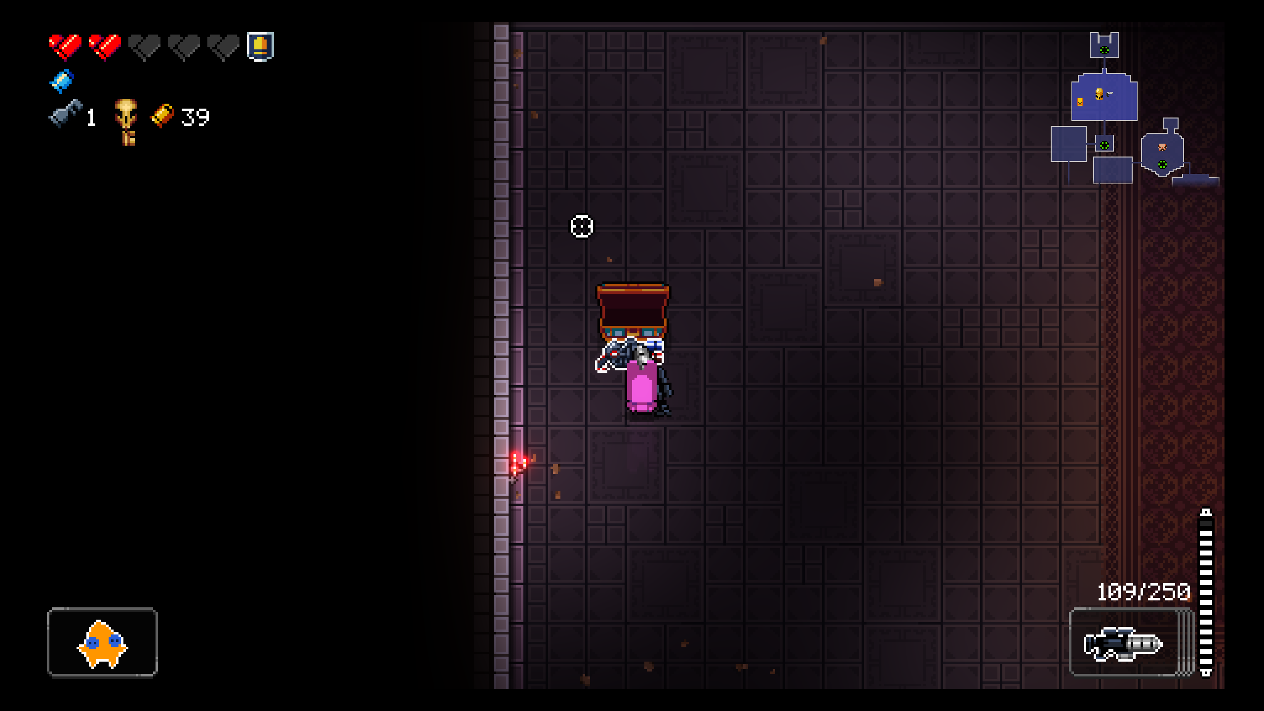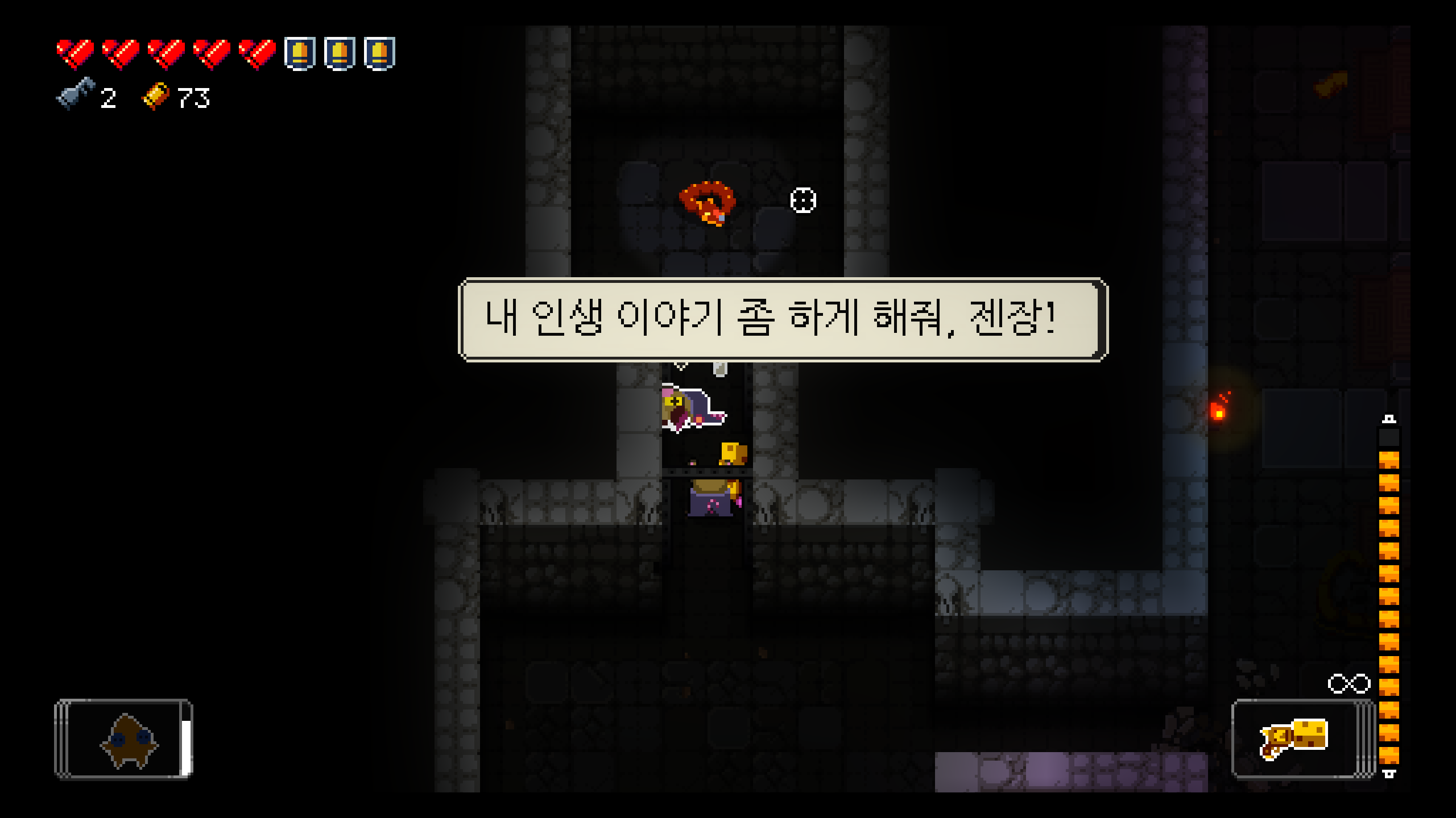 암흑 표지 차지 샷 쓸 때마다 공포탄이 나가는데, 황금 탄환 부적 덕분에 한 번 차지하면 방이 클리어됐습니다.