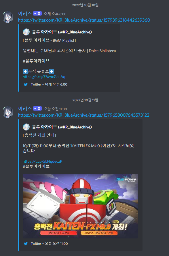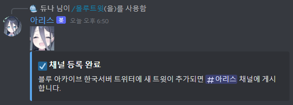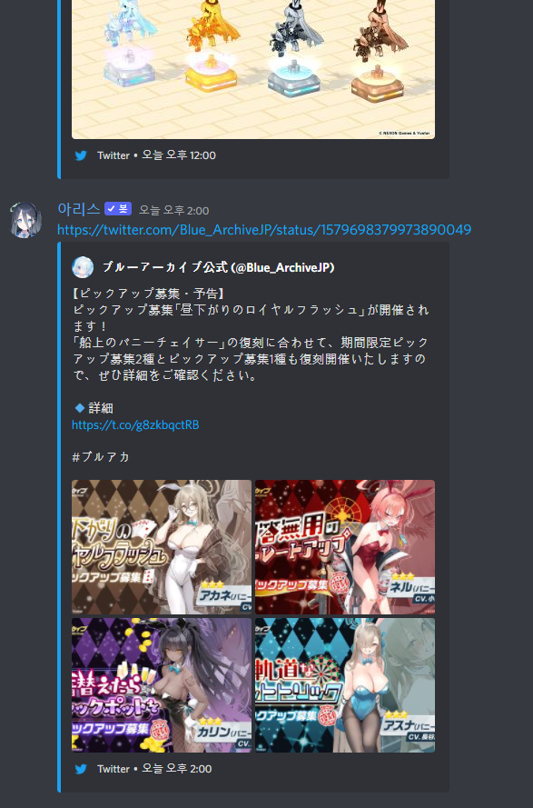 몰루트윗 명령어를 사용하면 해당 채널에 블루 아카이브 한국 혹은 일본 서버 트윗을 게시합니다.