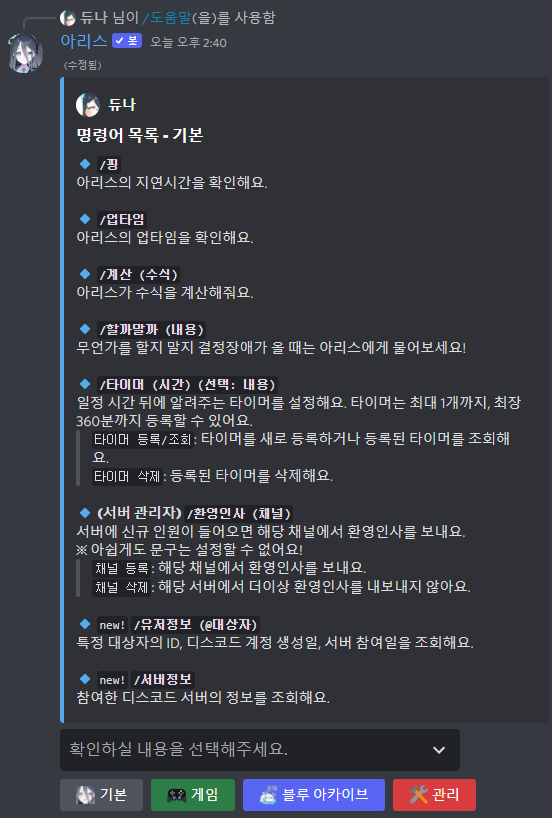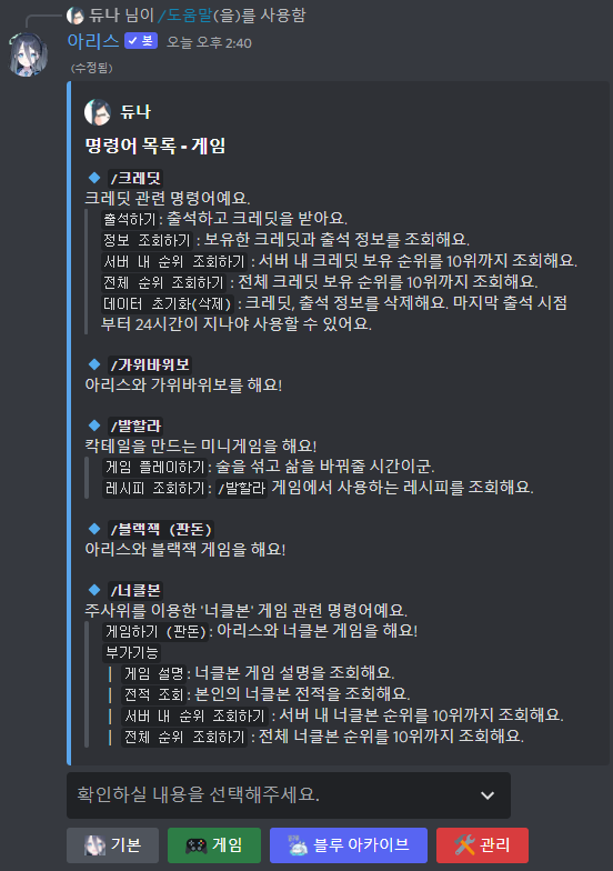 아리스봇은 게임, 블루 아카이브, 서버 관리 기능을 지원하는 다목적 봇입니다.