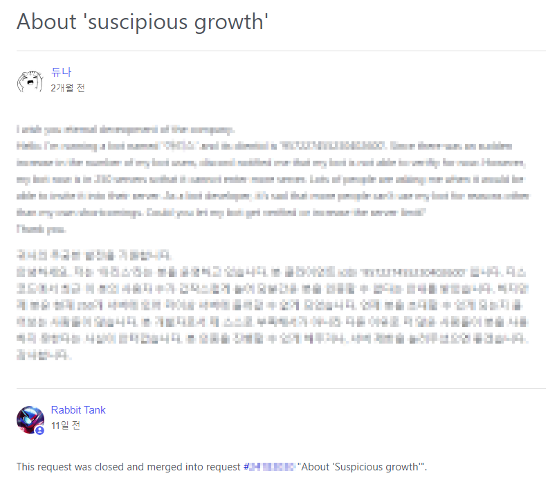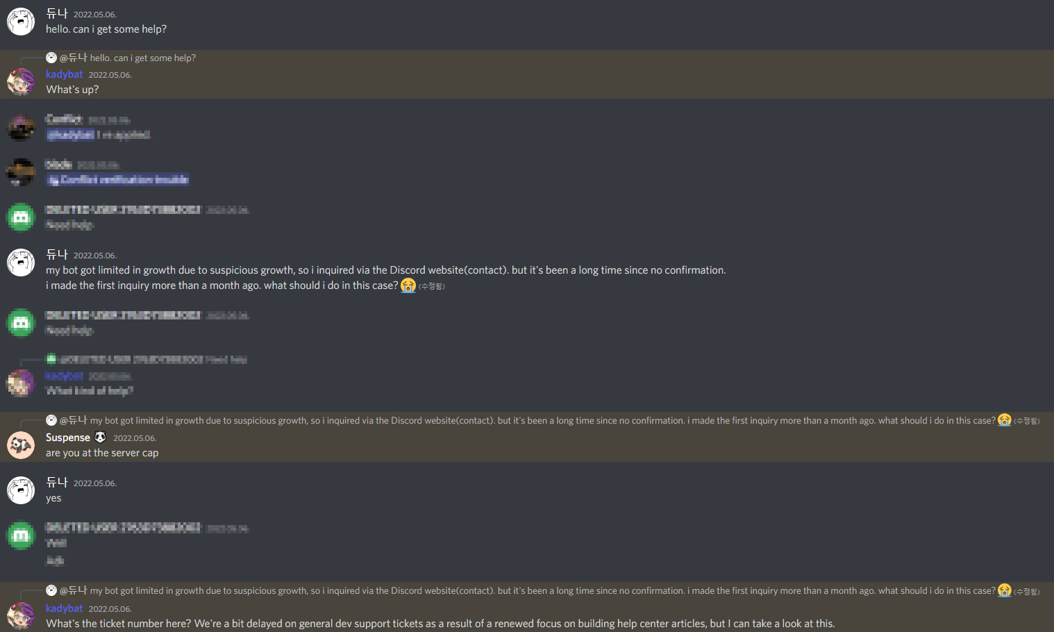 위 문의 하나가 해결이라고 뜬 건 직원에게 문의 확인을 겸해서, 문의 내용이 겹치니 병합해달라고 요청해서 그렇다.Application id를 오기재해서 다시 썼기 때문이다. 보면 알겠지만 문의 자체는 해결되지 않았다. 위 디스코드 직원에게 문의하면서 들은 내용이 가관이다. 직원에게 들은 바로는, 신규 직원 교육 때문에 문의 답변이 정상적으로 이루어지지 않고 있다고 한다. 해당 직원이 언급한 바에 따르면, 필자의 문의뿐만 아니라, 아주 간단한 내용의 문의조차도 답변이 되지 않고 있는 경우가 많다고 한다. 한 이용자가 자신의 문의가 매우 간단한데도 답변이 되지 않고 있다고 하자, 직원은 당시 해당 이용자에게 '당신의 문의는 정석적이며 처리하기 매우 간단해서 직원 교육을 위해 좋은 자료로 쓰이고 있습니다'라고 말했다.1 이게 말인가 방구인가? 처리하기 간단하다면 그냥 처리해주고 남은 자료로 교육을 하면 될 것 아닌가?