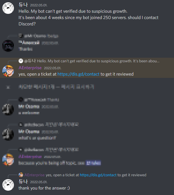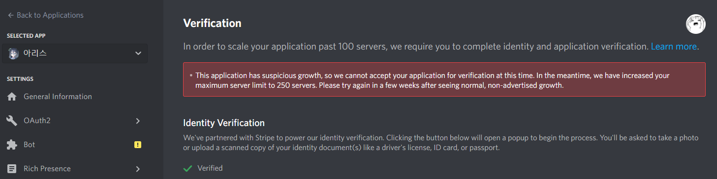 필자의 아리스봇은 성장이 너무 급격하게 이루어져서 인증받지 못하고 있다. 아리스봇은 배포 시작 후 1시간 반 만에 100 서버 접속을 달성하고, 250 서버로 제한이 늘어난 후에도 추가적인 홍보 없이 3일 만에 이를 달성했다. 서비스를 게시한 것이 3월 말 즈음이었으니 현재 1달하고도 반 정도가 지났기 때문에 위 도움말대로라면 정상적인 인증이 가능해야 하나, 그렇지 않다.