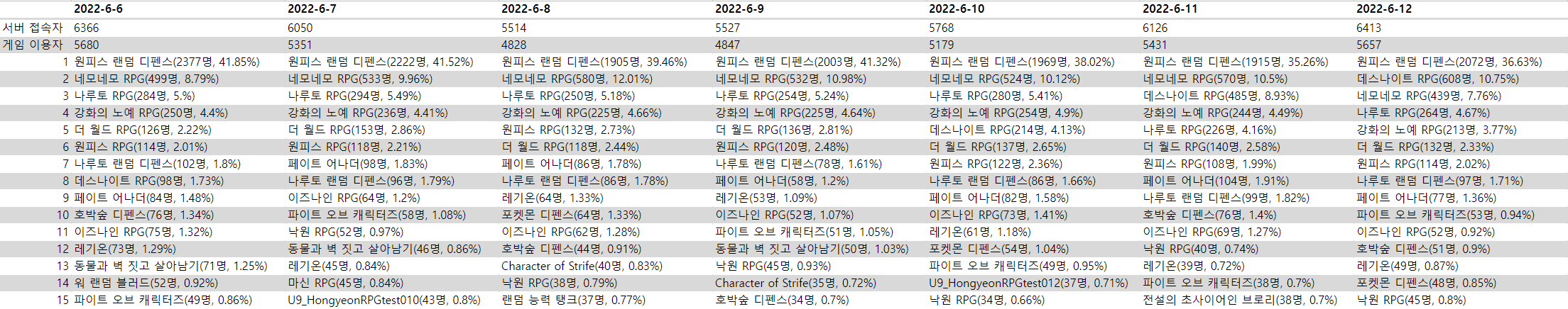 6월 3주차: 0620~0626 (0) 2022.07.01 6월 2주차: 0613~0619 (0) 2022.06.20 바빠서 통계 주말에 올림 (0) 2022.06.15 5월 5주차: 0530~0605 (0) 2022.06.08 맵 이용현황 관련 (0) 2022.06.01