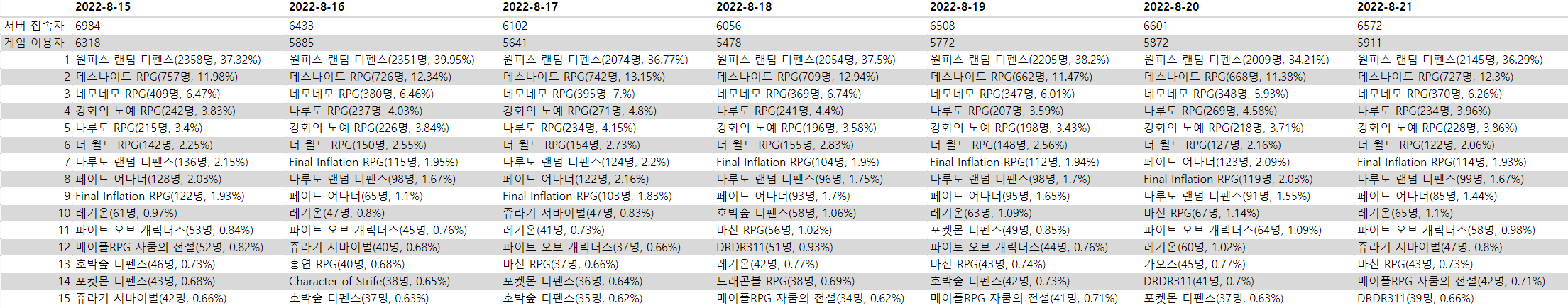 8월 3주차: 0815~0821업무/통계 2022. 8. 23. 11:28