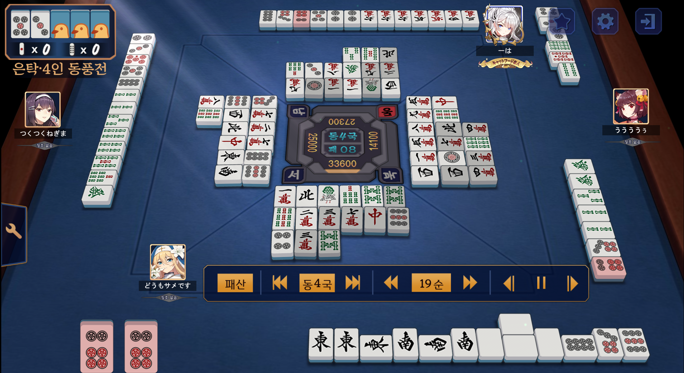 두 번째 배패는 혼일로 전환하려다가 너무 느려서 3순 69삭 양면 리치, 동순 대가 후발 리치한테 따임