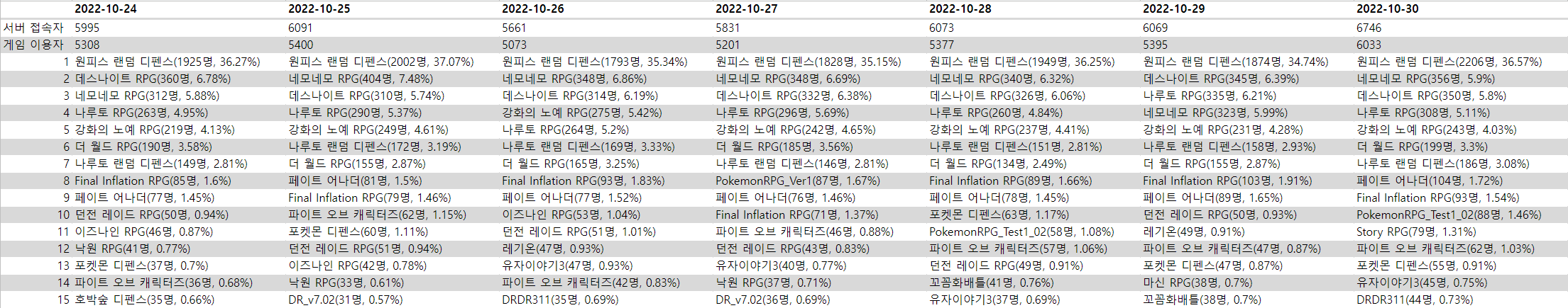 11월 2주차: 1107~1113 (0) 2022.11.16 11월 1주차: 1031~1106 (0) 2022.11.10 10월 3주차: 1017~1023 (0) 2022.10.29 통계 (0) 2022.10.25 10월 2주차: 1010~1016 (0) 2022.10.18