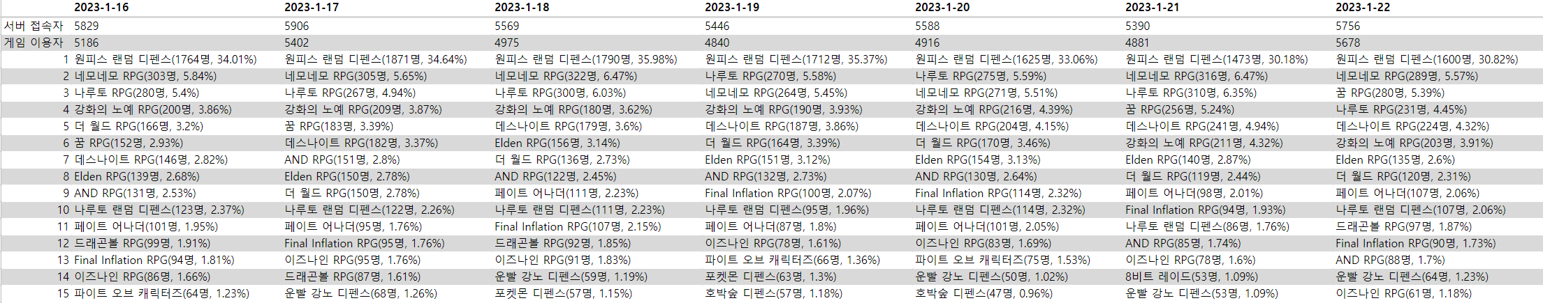 1월 22일에 살짝 이상한 게 보일 겁니다. 서버 접속자 수와 게임 이용자 수 차이가 너무 작죠?
