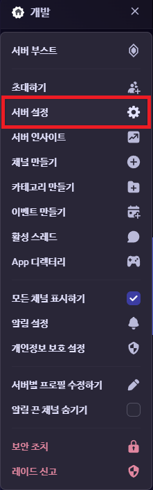 왼쪽 1) / 오른쪽 2) 이미지 1) 디스코드 서버 설정에 들어가 주세요.