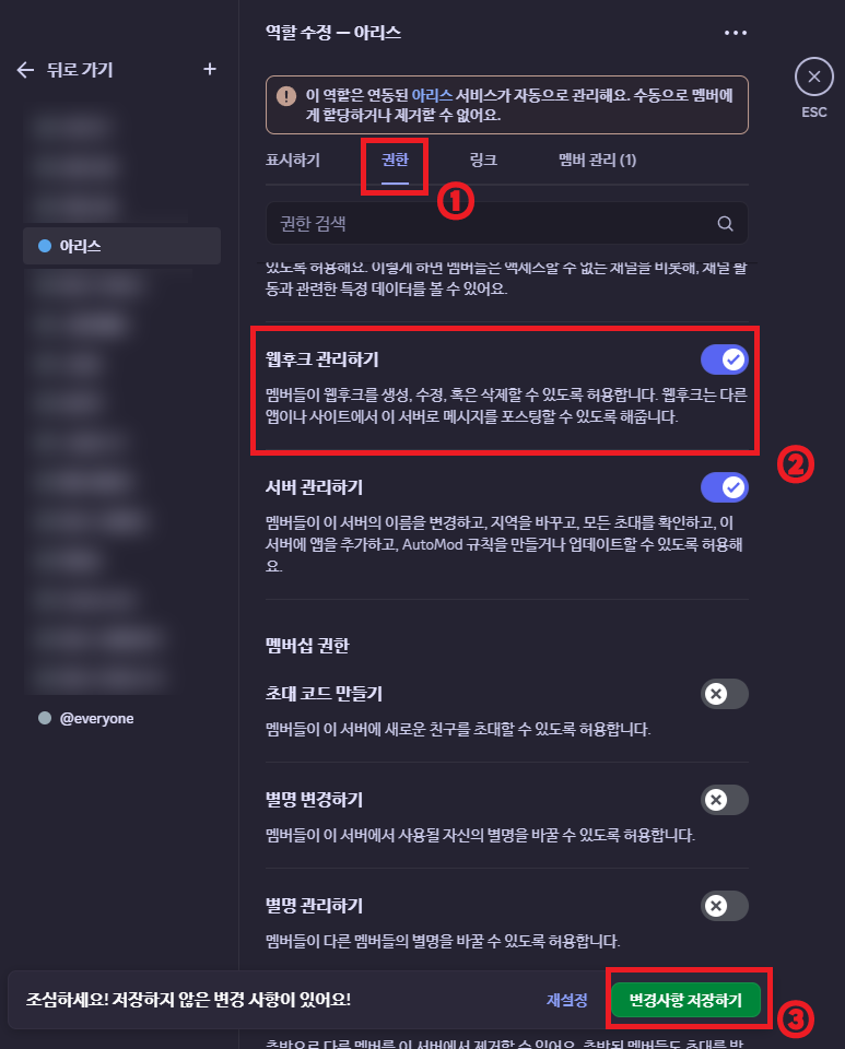 각종 알림을 웹훅 기반으로 변경하며 '웹훅 관리 권한'이 추가로 필요해졌습니다.