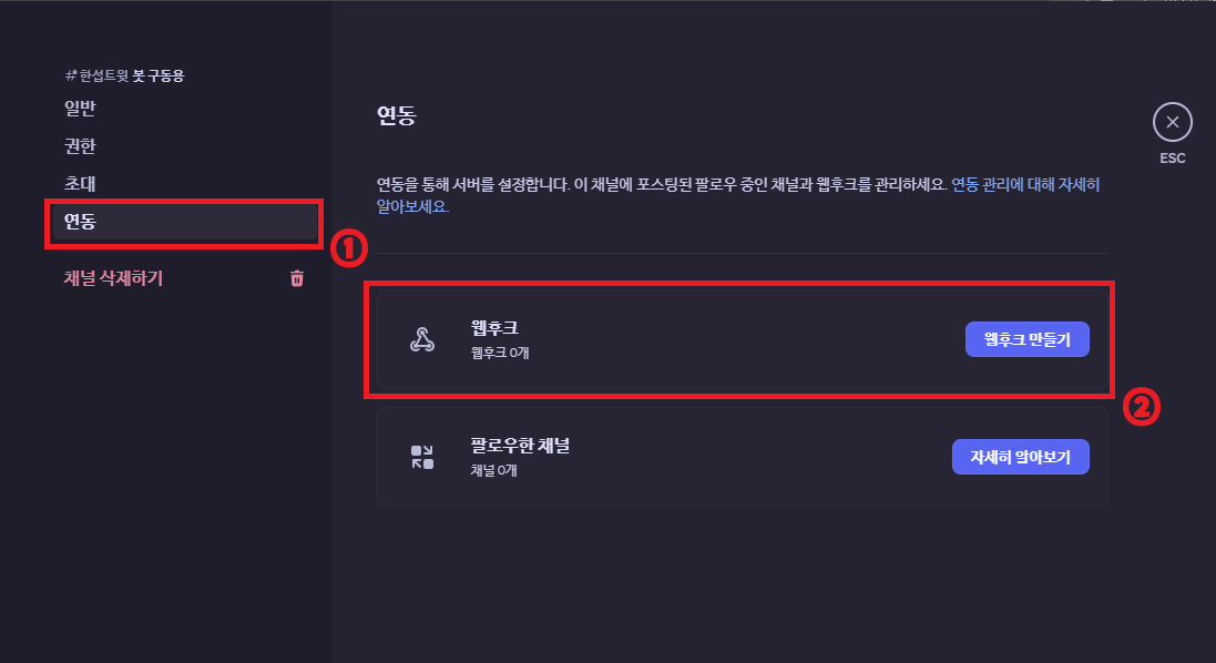 ② 웹후크를 눌러서 불필요한 웹후크를 삭제해 주세요.