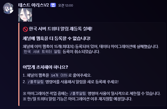 혹은 그냥 웹훅 수가 널널한 다른 채널에 등록하시면 됩니다.