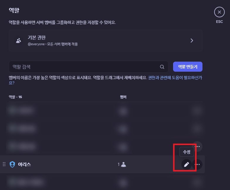 3) 이미지 3) 아리스의 역할을 찾아서 '수정' 버튼을 눌러주세요.