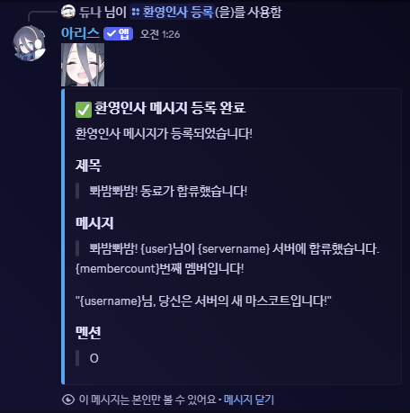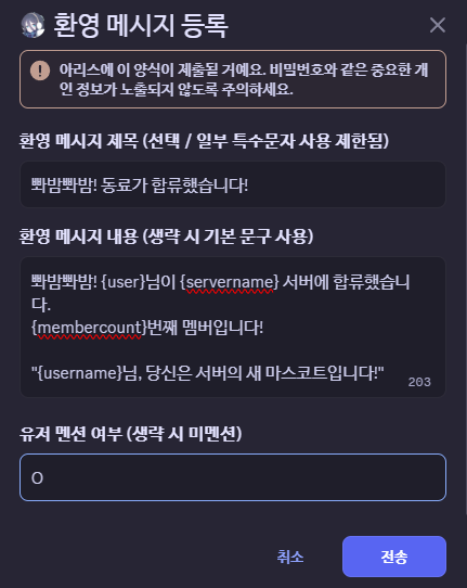 환영인사는 마이그레이션 안 한 대신, 제목/본문 지정할 수 있게 변경함(3. 기타 기능 참고)
