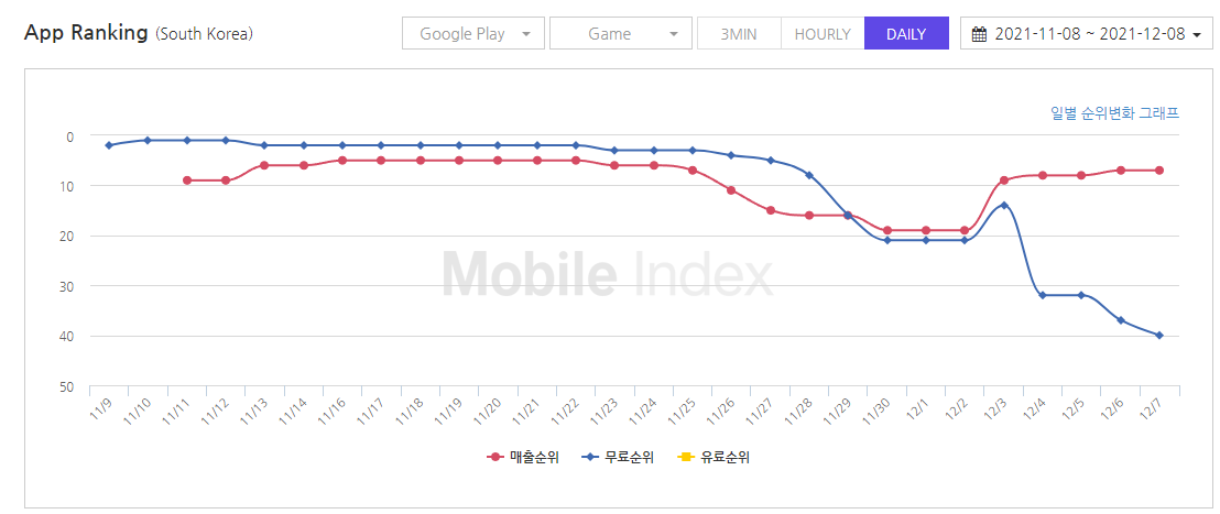따라서 블루 아카이브의 매출 순위는 위와 같이 총력전 출시인 11월 29일 이후 각 스토어에서 반등하는 모습을 보여줬습니다.