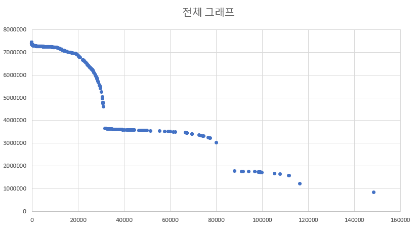 또한 과열된 경쟁 양상의 결과로 위 그래프에서는 특히 경쟁이 치열했던 플래티넘 하위권에서는 점수가 거의 비슷한 것과 애초에 경쟁을 어느 정도 포기한 10,000 위 바깥 구간에서는 점수가 확 떨어지는 모습을 볼 수 있습니다.