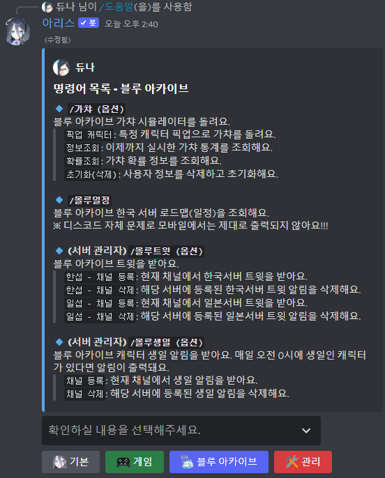 아리스봇은 게임, 블루 아카이브, 서버 관리 기능을 지원하는 다목적 봇입니다.