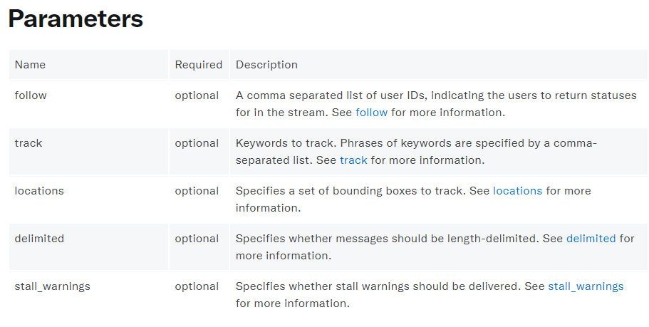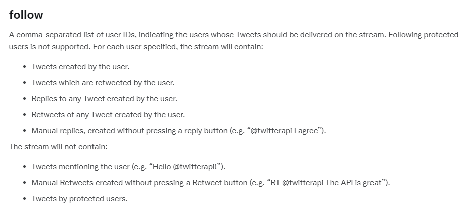 위 내용을 간단하게 번역하면 follow 필터는 특정 이용자의 트윗 활동에 대해서 아래와 같은 값을 가져온다.