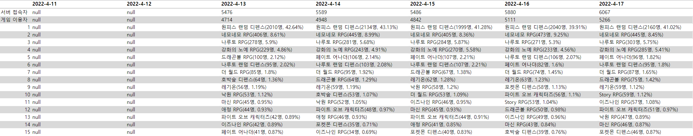 위 표를 예시로 들면, 위 표에서는 4월 13일과 17일은 오후 10시(/338 글에 게시된 것)에 이용자 수가 가장 많아 그 자료를 기준으로 게시하였고,