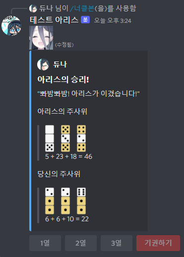 1. 둘 중 한 쪽이 주사위 9칸을 채우면 점수를 정산합니다. 누가 칸을 먼저 다 채웠건 간에, 점수가 높은 쪽이 승리합니다.