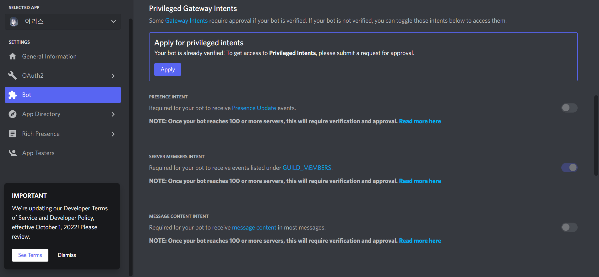 반면 SERVER MEMBERS INTENT는 지급받은 모습을 볼 수 있는데, 이는 서버에 인원이 추가되는 것을 감지하여 /환영인사를 송출하기 위해 심사를 거쳐 받은 권한입니다.