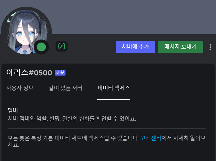 이는 위와 같이 봇 프로필에서 확인하실 수도 있습니다.